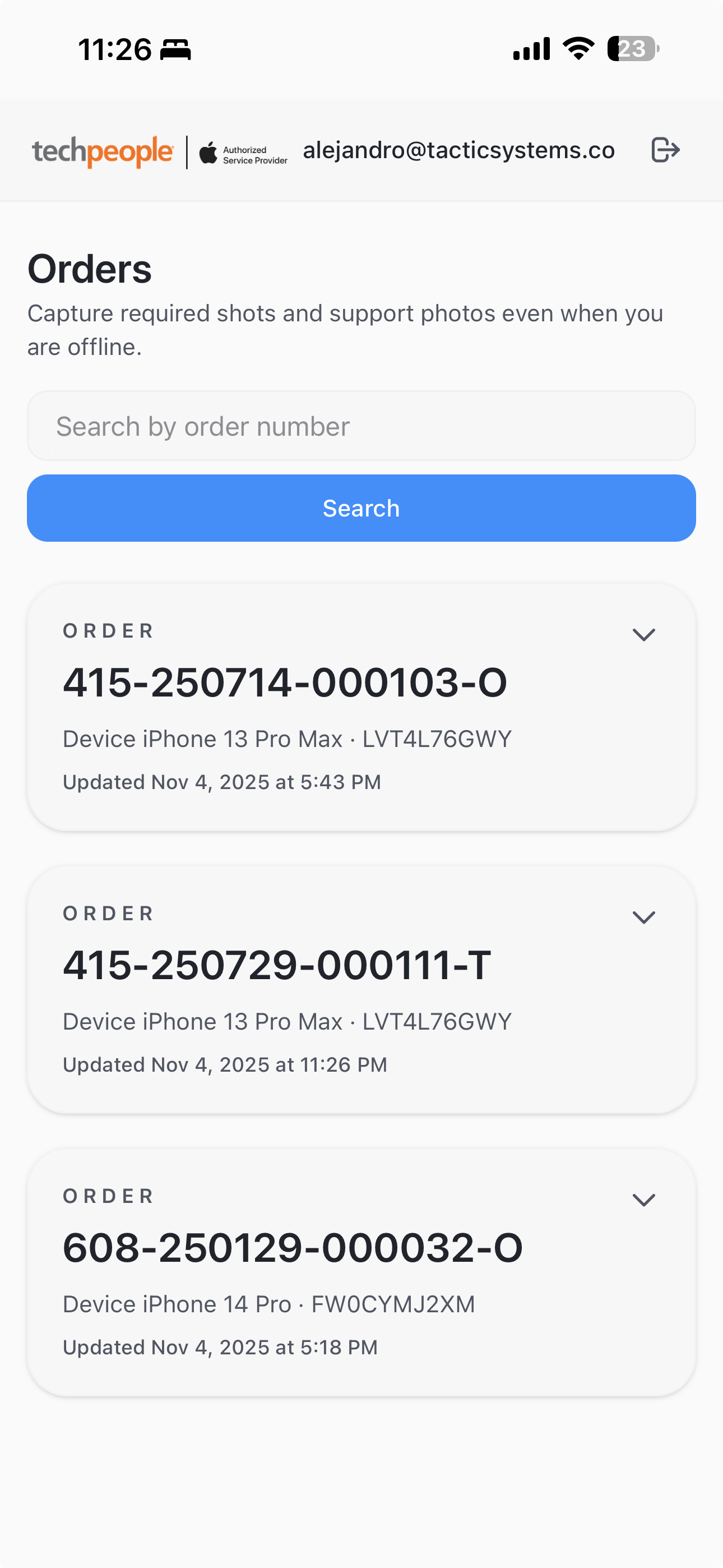 PANTALLA PRINCIPAL: LISTA DE ÓRDENESDespués de iniciar sesión, verás la lista de órdenes asignadas a ti y que tengan un VMI pendiente o se encuentren pendientes de firmas.