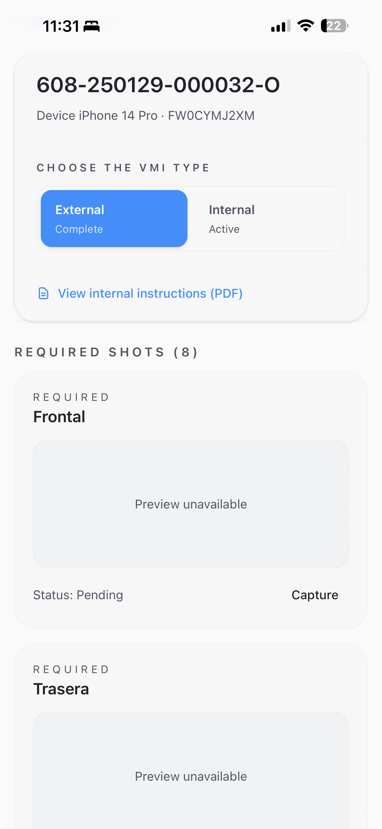 IMPORTANTE: El VMI interno requiere una firma de autorización antes de empezar a tomar fotos. El app te mostrará la opción de captura de firmas antes de proceder con el VMI interno.